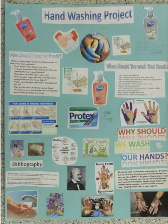 After studying micro-organisms, students made posters or power point presentations, designed to encourage their classmates to wash their hands. The emphasized the dire consequences of not doing so: bacteria and viruses are everywhere and you eat what you touch!